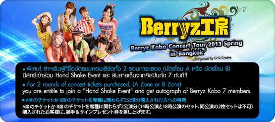 เหล่าแฟนคลับของ เบอร์รี่ซ์ โคโบ เตรียมจัดเต็มกับพวกเธอทั้ง 7 คนครบวงได้เลยในคอนเสิร์ตเต็มรูปแบบ เบอร์รี่ซ์ โคโบ คอนเสิร์ต ทัวร์ 2013 สปริง อิน แบงคอก (Berryz Kobo Concert Tour 2013 Spring in Bangkok) วันเสาร์ที่ 9 มีนาคม 2556 จำนวน 2 รอบแสดงคือ 14:00 และ 18:00 น. ณ สยามภาวลัย รอยัล แกรนด์ เธียเตอร์ ศูนย์การค้าสยามพารากอน ** เปิดจำหน่ายบัตรอย่างเป็นทางการตั้งแต่วันที่ 15 มกราคม 2556 เป็นต้นไป ทาง ไทยทิคเก็ตเมเจอร์ ทุกสาขา หรือ www.thaiticketmajor.com โทร. 02-262-3456 บัตรราคา 3,500 และ 4,000 บาท ** สิทธิพิเศษสำหรับทุกท่านที่ซื้อบัตรชมการแสดงทั้งสองรอบ (ราคา 3,500 หรือ 4,000 บาทก็ได้) รับสิทธิ์เข้าร่วมกิจกรรม Hand Shaking Event พร้อมรับลายเซ็นจากศิลปินทั้ง 7 สาวทันที ** งานนี้สร้างสรรค์โดย บริษัท จี-ยู ครีเอทีฟ จำกัด สนับสนุนโดย บริษัท ไทยประกันชีวิต จำกัด(มหาชน), บริษัท ปตท จำกัด(มหาชน), ไมนิจิ อะคาเดมิค กรุ๊ป และ โรงเรียนสอนภาษาญี่ปุ่นไมนิจิ ติดตามรายละเอียดเพิ่มเติมได้ทาง www.berryzkoboliveinbangkok.com และ facebook fanpage : Berryz Kobo Thailand