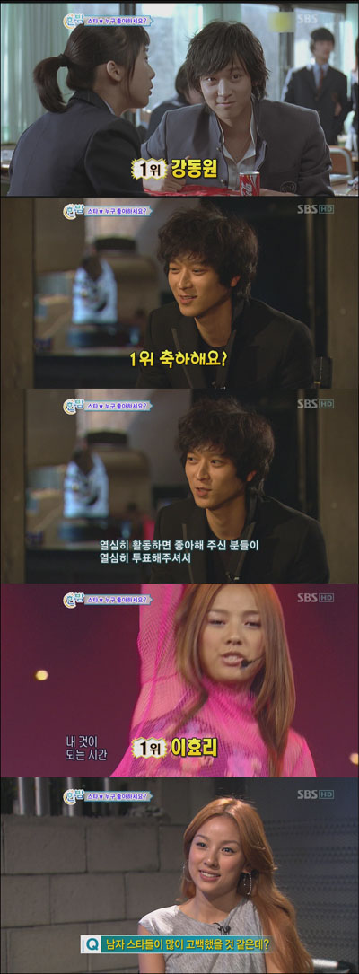 28 ตุลาคม 2553 ในรายการ SBS ‘Night TV Entertainment’ ได้มีช่วง ‘ศิลปินชอบใคร’ โดยในช่วงนี้เป็นการเปิดเผยผลสำรวจของทีมงานที่ได้ไปถามความคิดเห็นจากบรรดาคนบันเทิงจำนวน 173 คน เกี่ยวกับหนุ่มสาวในอุดมคติของพวกเขา