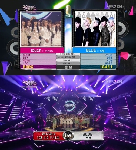 9 มีนาคม ในรายการ KBS 2TV ‘Music Bank’ บิ๊กแบง สามารถส่งเพลงไตเติ้ล ‘BLUE’ คว้าอันดับที่ 1 ในเคชาร์ตได้เป็นผลสำเร็จ