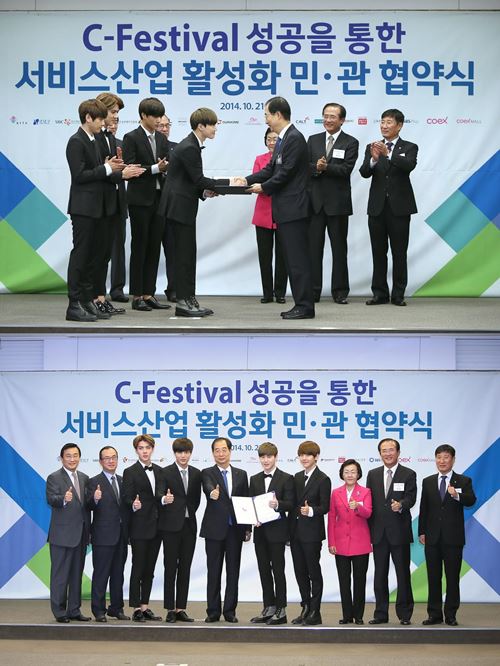 21 ตุลาคม 2557 ช่วงเช้า ณ เทรดทาวเวอร์ ซัมซองดง กรุงโซล EXO-K เซฮุน ซูโฮ ไค แบคฮยอน เข้าร่วมพิธีรับการแต่งตั้งเป็นทูตกิตติมศักดิ์งาน ‘C-FESTIVAL’