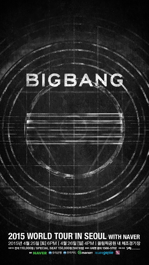 2 เมษายน YG Entertainment เปิดตัวโปสเตอร์ บิ๊กแบง (BIGBANG) เวิลด์ทัวร์ ‘2015 WORLD TOUR IN SEOUL WITH NAVER’ ที่จะมีขึ้นในวันที่ 25-26 เมษายนนี้ ก่อนที่พวกเขามีแผนจะไปพบกับแฟนๆทั่วโลกต่อไป