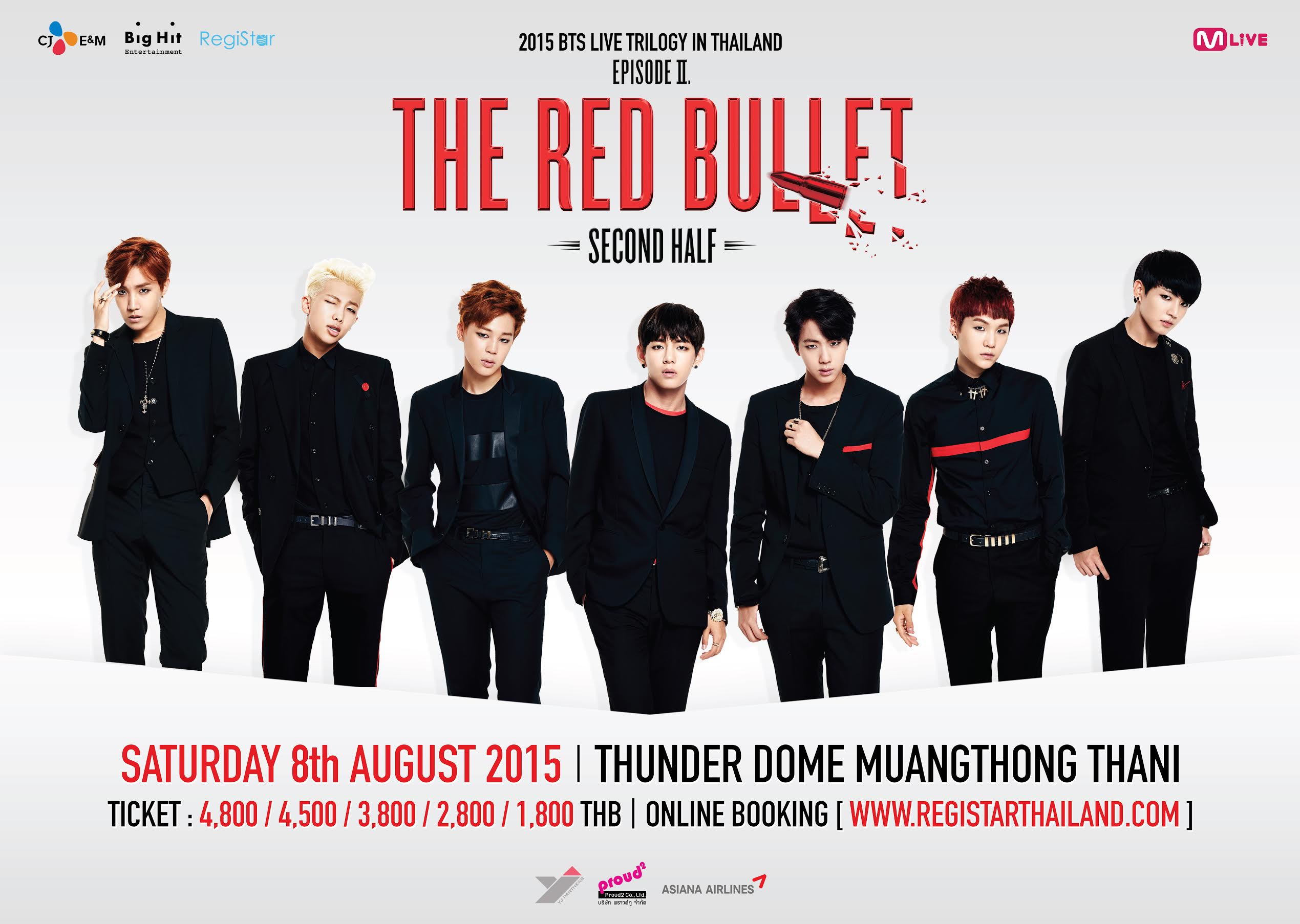 ฉลองการกลับมากับผลงานใหม่ล่าสุด และเพื่อให้หายคิดถึงหนุ่มๆ BTS ทั้งผู้จัด RegiStar และต้นสังกัด Big Hit Entertainment เลยเอาใจอาร์มี่ไทยเต็มที่กับคอนเสิร์ตที่หนุ่มๆ บอกเลยว่าพิเศษและเตรียมมาให้เฉพาะแฟนๆ ชาวไทยจริงๆ 2015 BTS LIVE TRILOGY : EPSODE II. THE RED BULLET ~SECOND HALF~ เป็นคอนเสิร์ตสุดพิเศษที่ทุกคนจะได้เห็นถึงการเติบโตและพัฒนาการของหนุ่มๆบังทัน และเพลงในอัลบั้มล่าสุดของพวกเขา พบกับพวกเขาในคอนเสิร์ตสุดมันส์ได้ใน วันที่ 8 สิงหาคม 2558 ธันเดอร์โดม เมืองทองธานี บัตรราคา 4,800 / 4,500 / 3,800 / 2.800 / 1.800 บาท สิทธิพิเศษมากมายสำหรับเหล่าอาร์มี่ที่จองบัตรในช่วงพรีเซลล์ระหว่างวันที่ 20-30 มิถุนายน 2558 ผ่านช่องทางจำหน่าย www.registarthailand.com