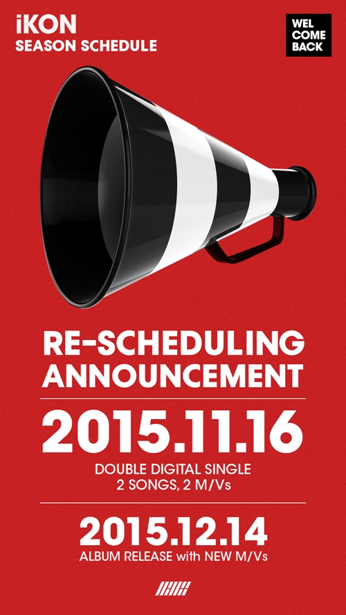 28 ตุลาคม เวลา 14.00 น. YG-LIFE ได้โปสภาพโปสเตอร์ ‘RE-SCHEDULING ANNOUNCEMENT’ ของ iKON พร้อมการปรับเปลี่ยนวันวางจำหน่ายผลงานเพลงใหม่